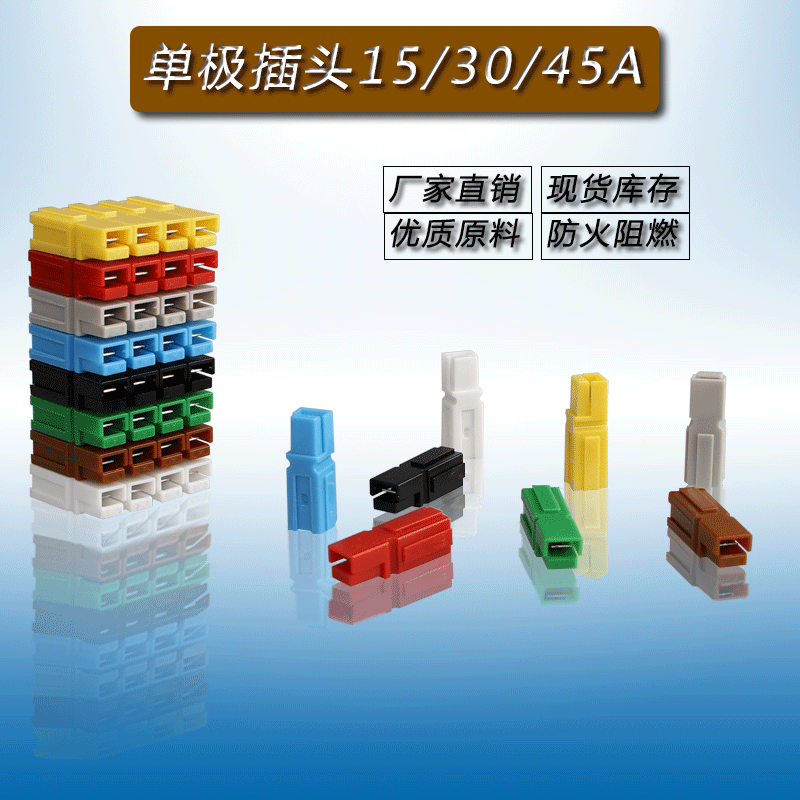 圣恩迪插頭單極45a、不分公母、同顏色對插、有顏色:紅色、藍色、灰色、白色、褐色、綠色、黃色,黑色、可同顏色拼接成多極對插、可不同顏色拼接成多極對插、方便組合、